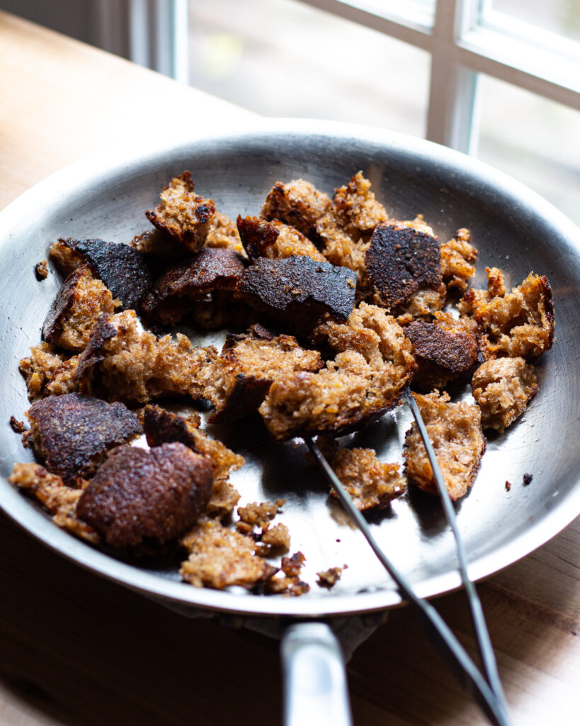 Here I make my croutons in a sauté pan. It’s quick, and it doesn’t heat up your house by making you turn on the oven. Just make sure to place a pan over medium heat and add a good glug of olive oil. The olive oil will help the croutons to get all golden brown and delicious. Cook them undisturbed for 3-4 minutes, then move them around the pan and cook an additional 4 minutes until they are golden.