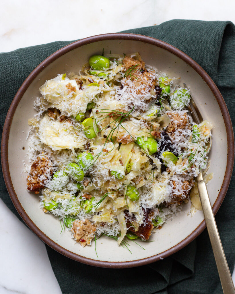 Fennel can easily be swapped for celery or kale! The sweet white onion can be swapped for red onion, but I wouldn’t recommend yellow onion, that might be too harsh. The fava beans can be subbed for edamame, which has a similar flavor and texture.