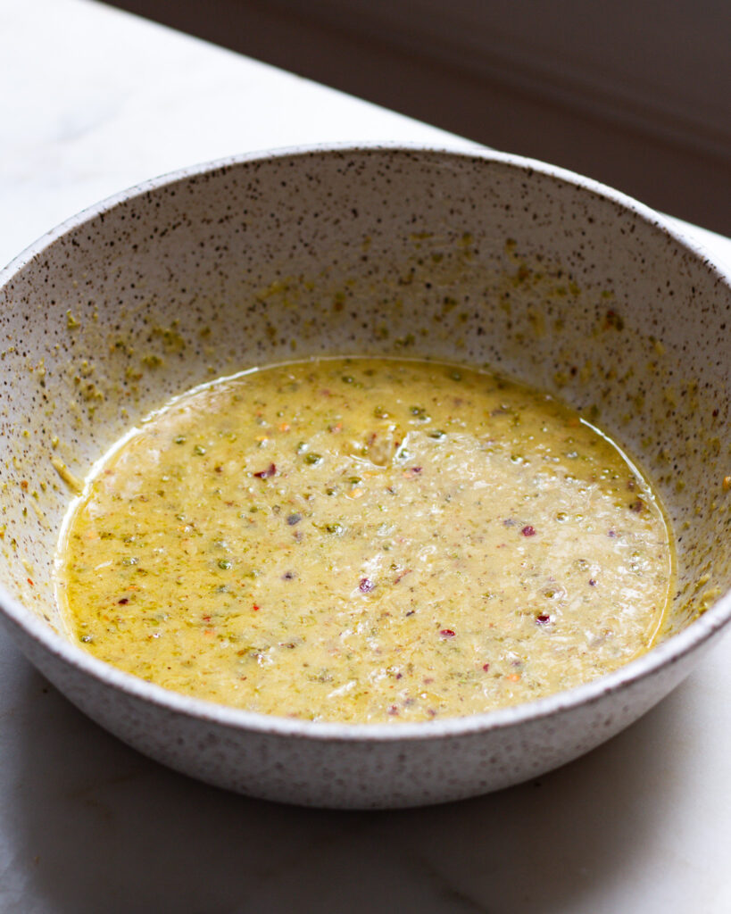 I love making dressings directly in the bowl I plan to toss the salad in. It cuts down on dishes, but also gives you a large area space so that whisking the dressing is easy. Here is everything you’ll need to make this oregano dressing: