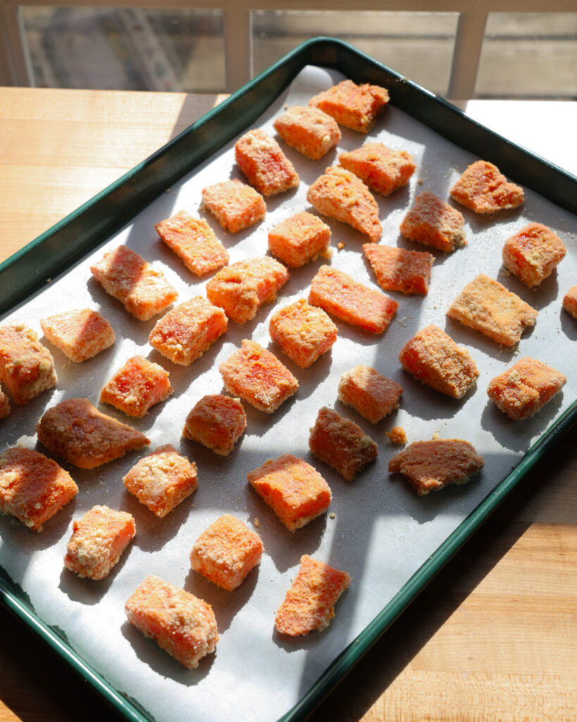 For a dairy-free nugget, use a coconut yogurt or a cashew cream to mimic what the yogurt is doing here. You just want something with a bit of fat that can adhere to the salmon and make it tender while allowing the breading to crisp up in the oven.
