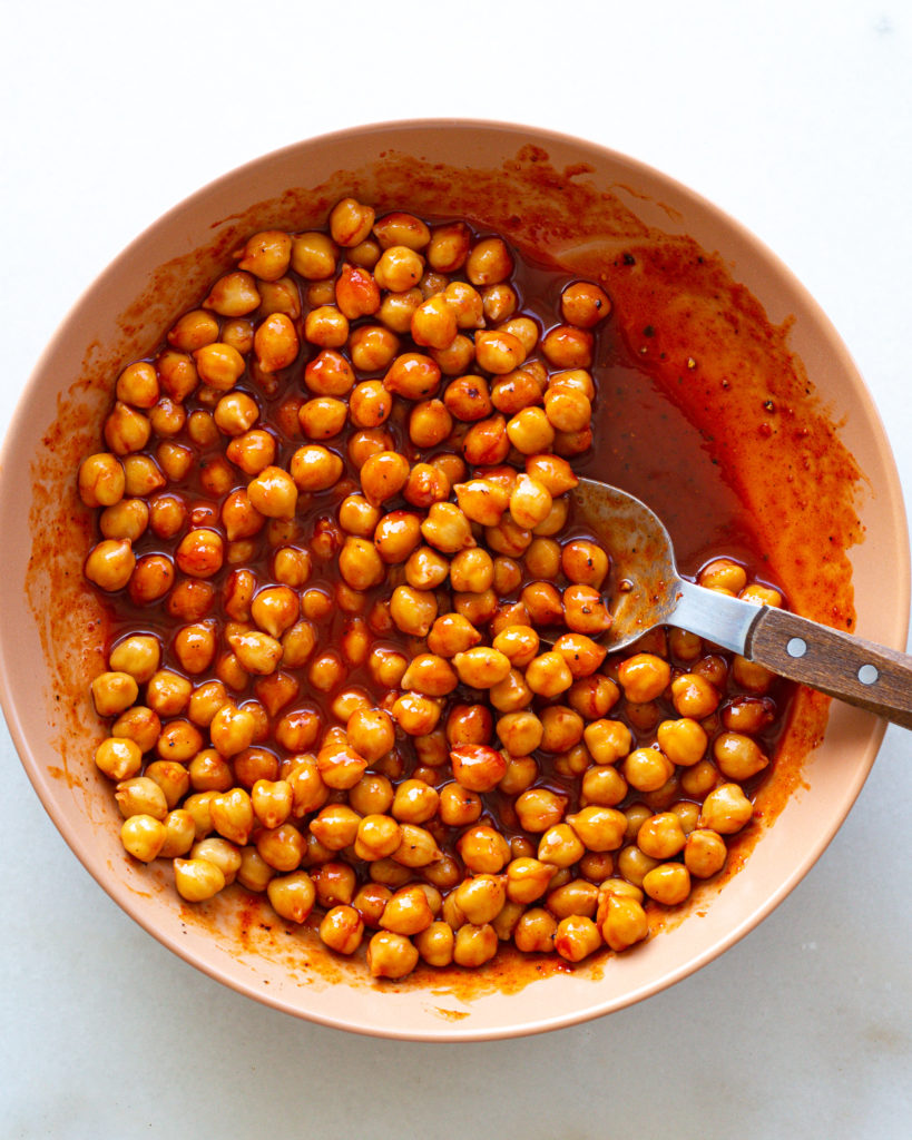 - Add the chickpeas to the gochujang mixture and toss to coat them fully.