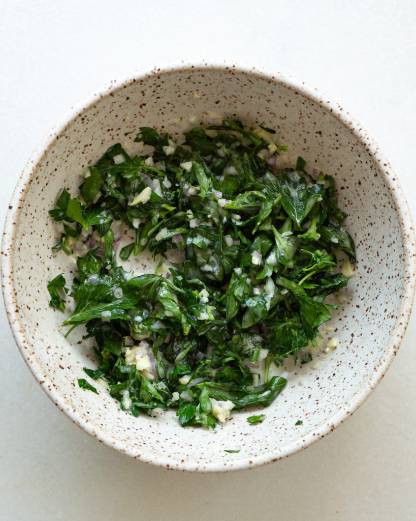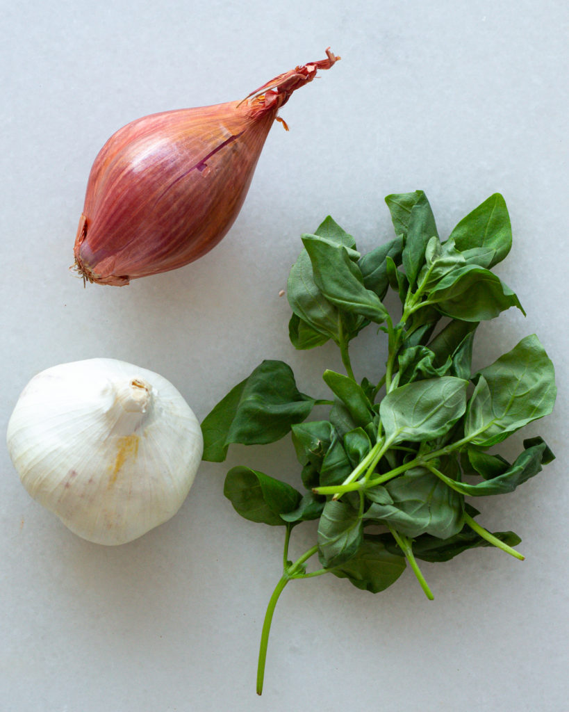 - In another bowl, combine the finely chopped shallot, the garlic cloves, the torn basil and parsley and the coconut milk. Mix until combined and season with salt to taste.