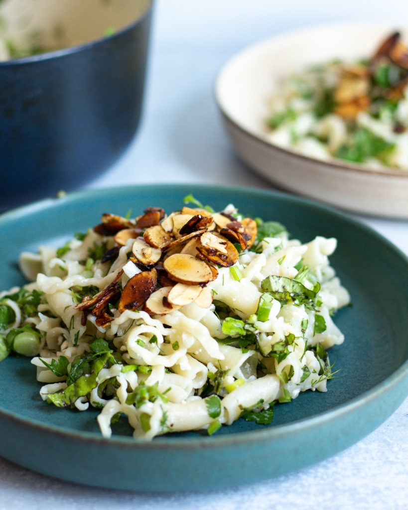 - Serve the pasta warm and top with the salted lemon almonds. And that’s it!