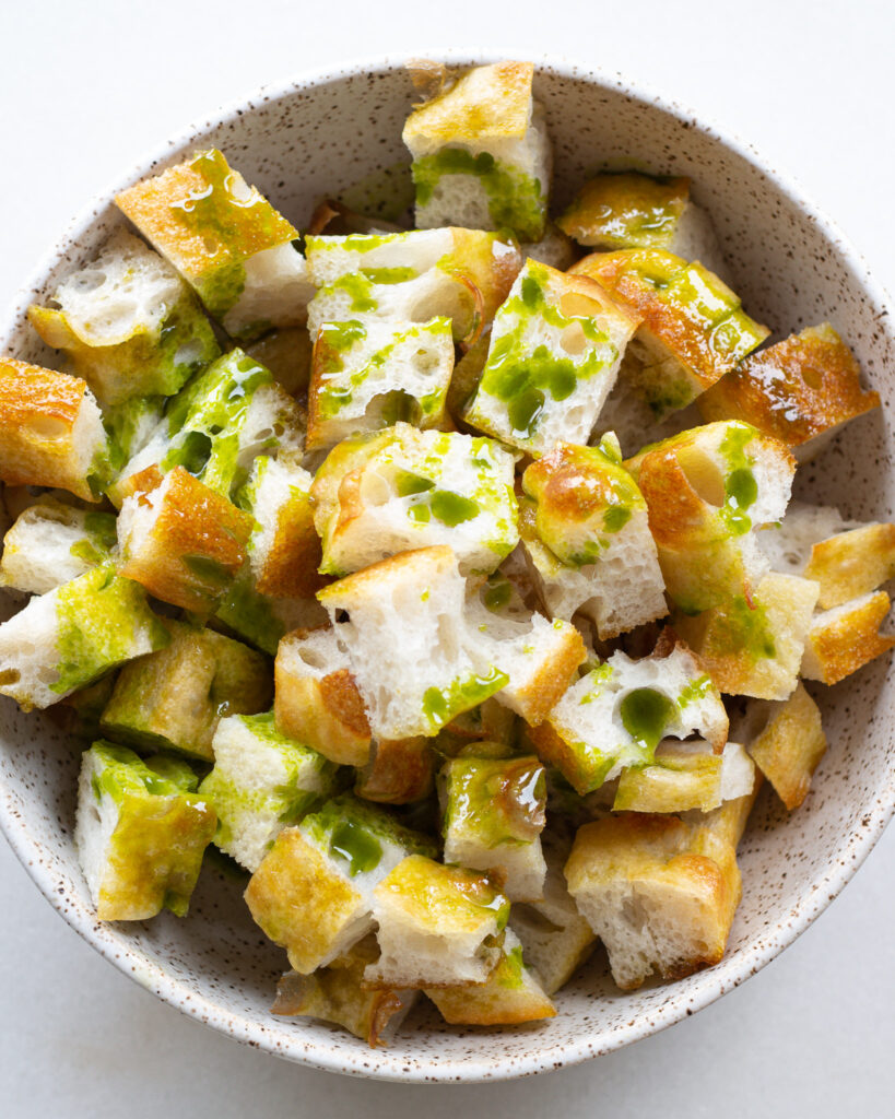 - Cube the focaccia into 1 inch square pieces. Drizzle with the parsley oil and toss to coat.