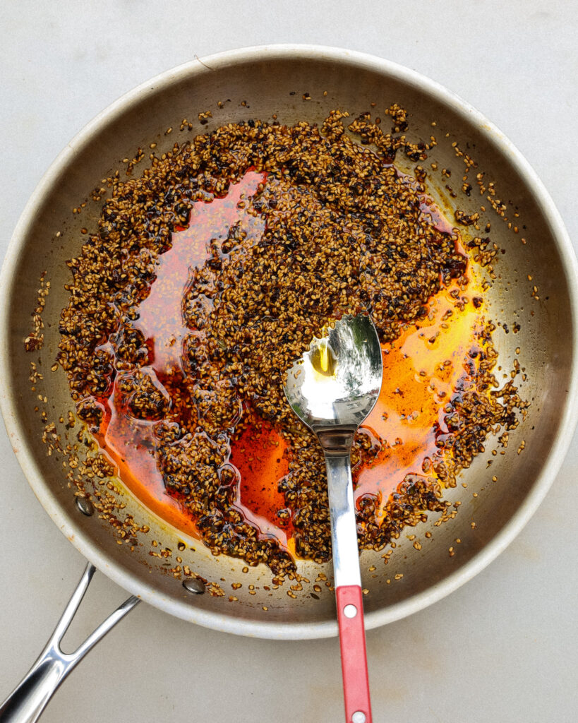 Let the sesame seeds and oil come to a simmer, then as soon as the sesame seeds are golden, remove everything from the heat.
