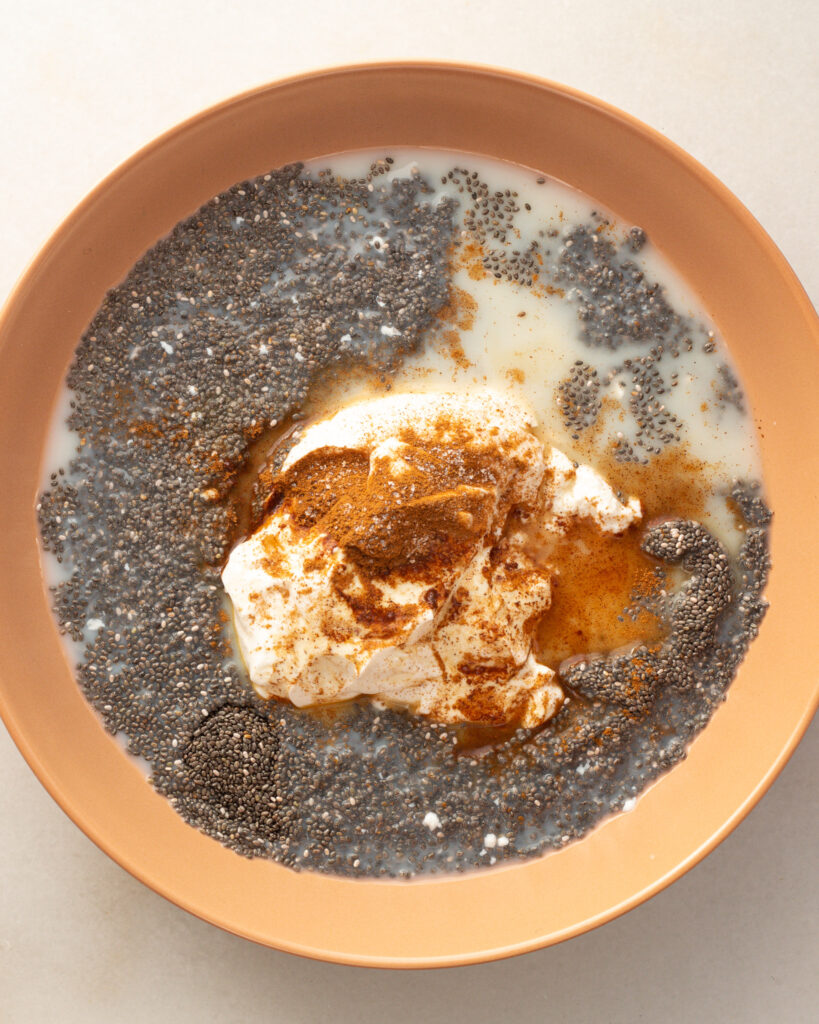 Ok, so you always hear me talk about flavor first (this is a food blog, of course!) but chia pudding is also incredibly good for you. Chia seeds are little powerhouses that are loaded with omega 3 fatty acids, protein, antioxidants and fiber. The soluble fiber in chia seeds absorbs moisture around it, giving chia pudding that thick texture, but also helping you feel full and satisfied. Plus they are god’s little gift to digestion. YOU KNOW WHAT I MEAN. And in this particular recipe, we use yogurt for more protein, and cinnamon for more nutrients. This chia breakfast is filled with whole food benefits, and I hope you’ll feel it when you try it! If you’re curious about more benefits from chia seeds, you can read more about them here.