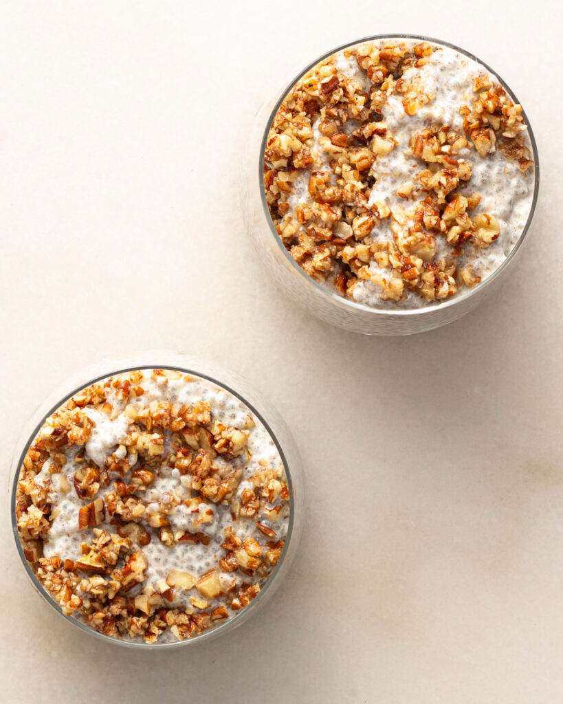 - In your ramekins or jars, add a layer of the pecan crust, then half of the chia pudding. Leave in the fridge to set for at least 30 minutes, then drizzle with more honey and more chopped pecans and enjoy!