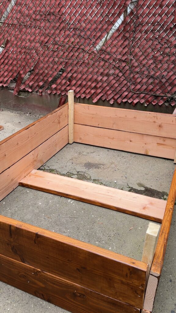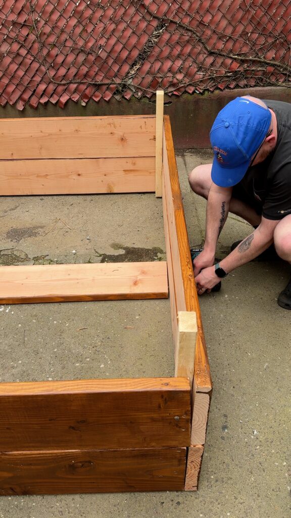 For a wood garden bed, drainage and stability are crucial. The reason we attach the 2x2s to the 6-foot plank is so that the interior of the garden beds is 4-feet even. This means you can slot in a 4-foot plank across the center to help stabilize the beds and relieve any pressure from the soil.