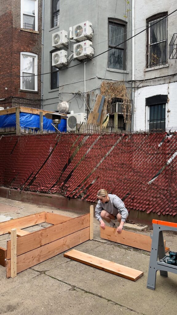 We had a bit of trial-and-error with the best way to do this, but we found the easiest way to slot in the 4-foot planks and complete the garden bed was to lay out the 6-foot pieces as if we were building the bed, then slot the 4-foot pieces right in.