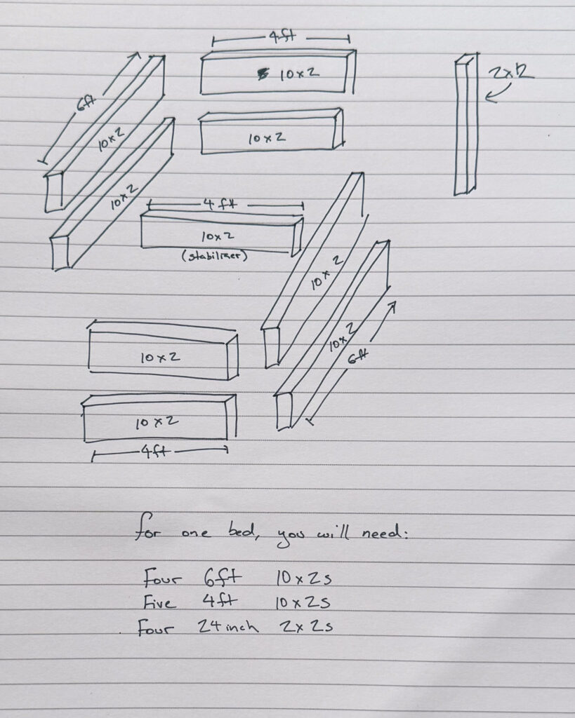 - Five 10-inch by 2-inch planks, cut to 4 feet in length (one of these will serve as the piece across the bottom of the bed)
