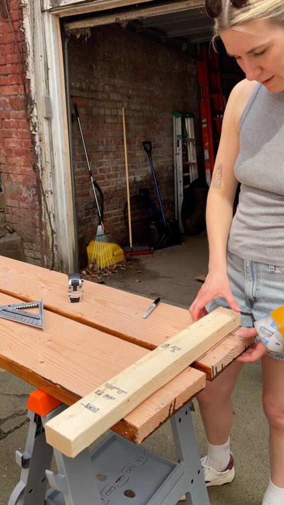 Adhere the 2x2s on either side of the 6-foot plank, making sure to mark in two inches each time.