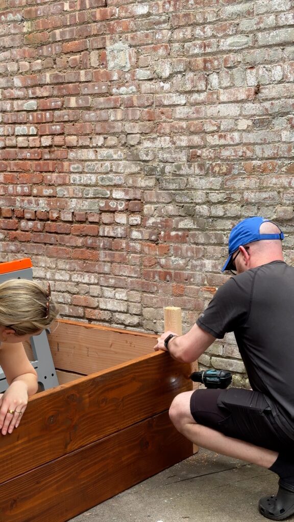 Using Planter Wall Blocks – Instead of drilling planks together, there is the option of using affordable concrete planter blocks as corners, then just slotting in the planks. Our surface is uneven, so I decided this wouldn’t be as solid as we would need it to be. However, I’ve seen gardeners who are doing 12-inch tall beds on grass have great success with these! The one other negative? They can get pretty heavy.