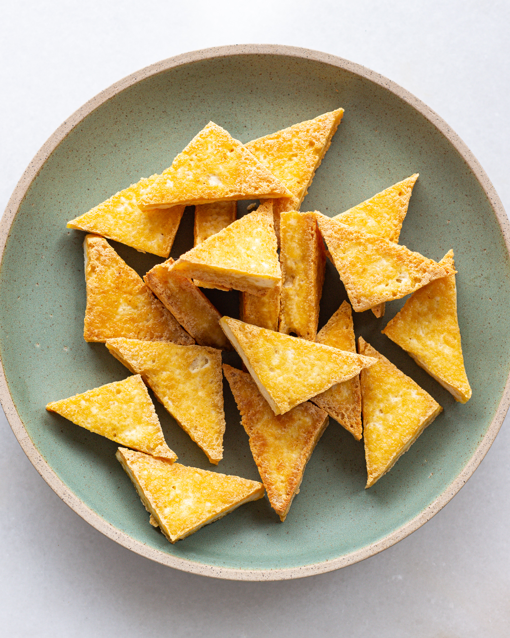 Great question! Contrary to popular belief, I don’t own a tofu press. But that’s only because I prefer to press my tofu in pieces. That way you can press them for less time, but still draw out more moisture.