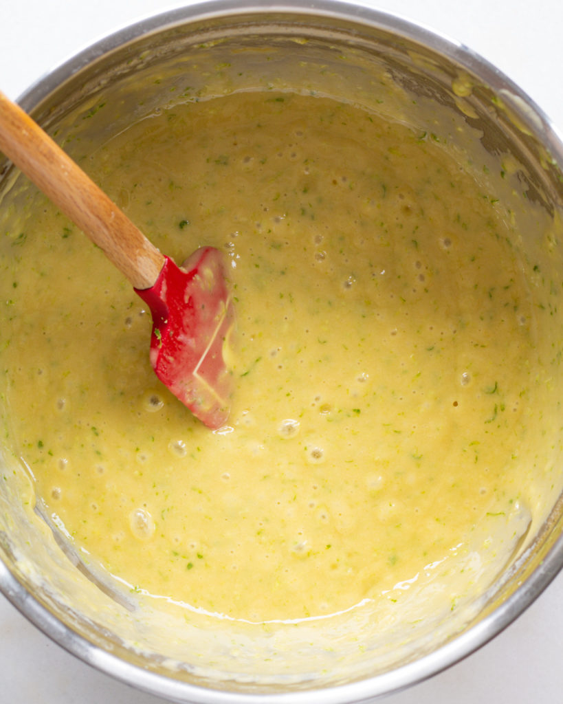 - Add in the 3 tbsp of lime juice and the zest from one lime. Use a spatula to swirl this into the batter until evenly mixed.
