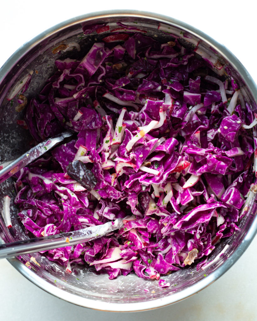 Of course, if you don’t want to serve this in the bite-sized format, feel free to chop up the red cabbage into shreds and make this a whole salad bowl. It will take less time to serve and assemble and will be more like a traditional salad, but with all the same flavors!
