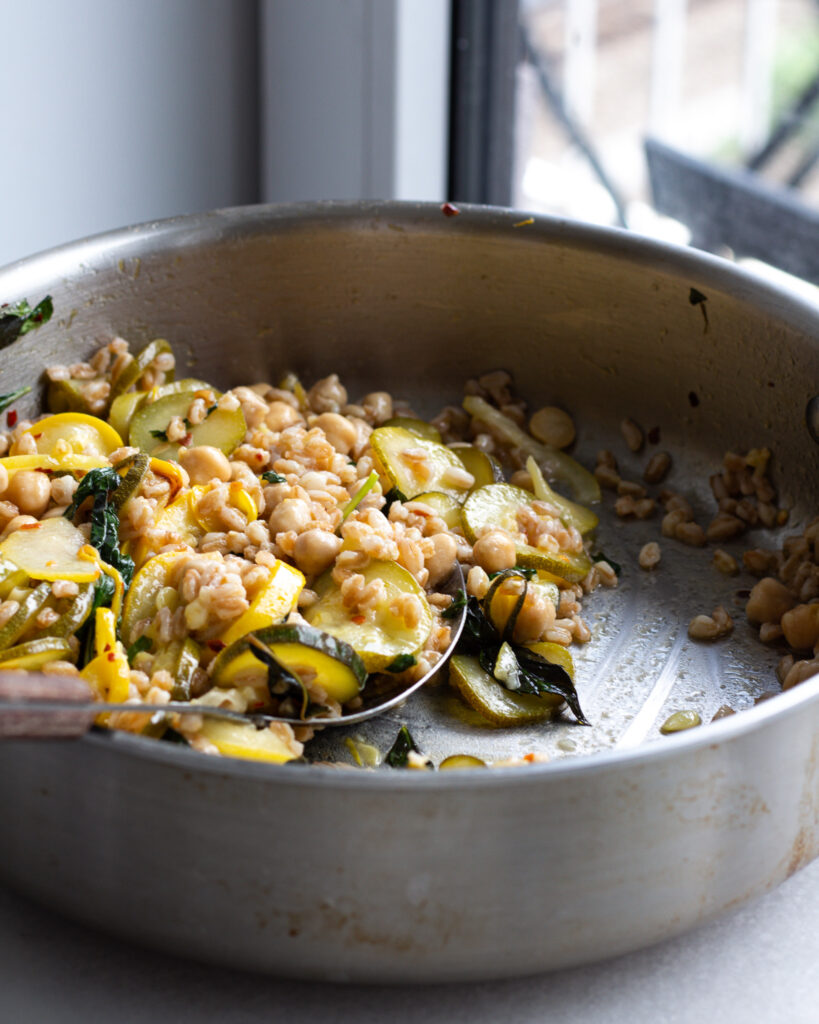 What you do get with this recipe needs no caveats – it’s an easy, wholesome, full meal that is built with great flavor and super-simple ingredients. I know I always say my recipes are simple (they are!) but this one is one of my go-to dinners because of how quick and easy it is. Your grains will cook the same time as your vegetables, so everything will finish around the same time. Lemons add a burst of brightness, while salt and chili flakes temper them out. Zucchini are the main vegetable, cooking down into their perfectly comforting texture and absorbing all the good flavor in the dish. Mint and basil are nearly crucial to add some freshness, and then you’re left with a really filling, really easy dinner. And if you’re a parmesan cheese head (which I am), feel free to add some to this. You can add at the end as a topping, or when you add the grains to really amp up the melt-factor.