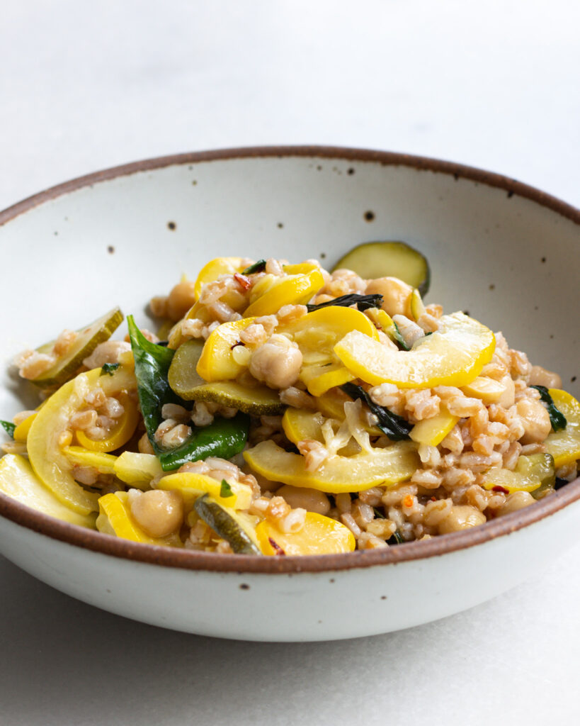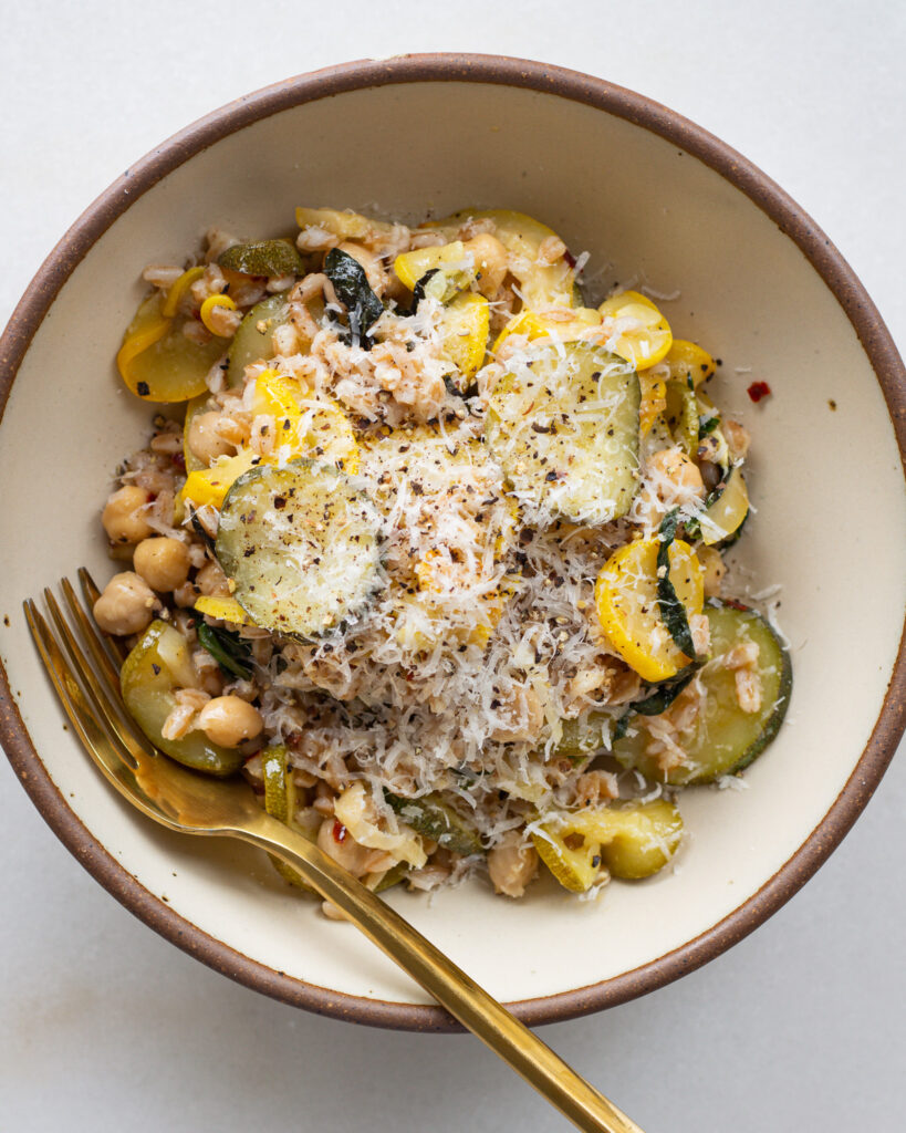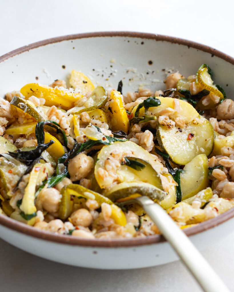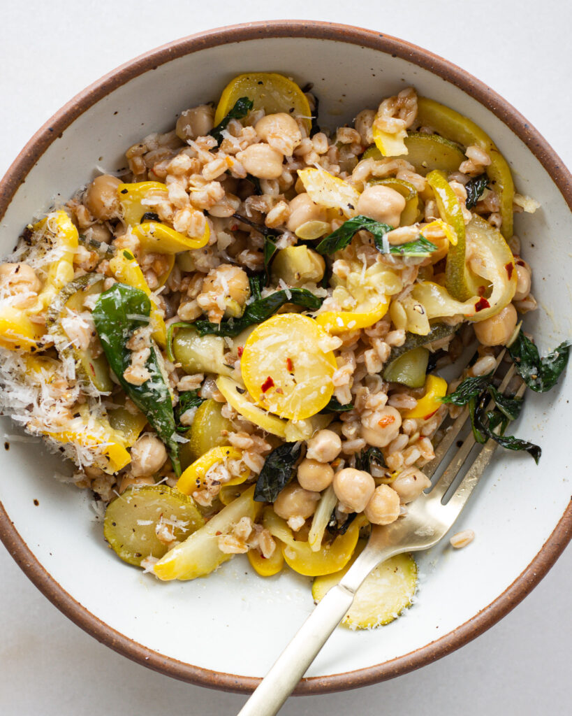 This lemon zucchini farro bowl uses a whole lemon. And you heard that right. It’s for good reason, too, a whole lemon is kind of like an onion. It has a really sharp and strong taste when it’s raw, but when you cook it down, it turns into something soft, mellow, and an absolute flavor bomb. People eat lemon rinds raw all the time (I’m not going to get into it….there are many opinions!) but I find it’s a much easier sell to convince people to eat lemons cooked. And in this lemon zucchini farro bowl, you might not even notice them! They blend in quite well with the summer squash, delivering only on flavor.