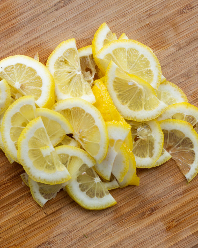 - Halve the lemon lengthwise and slice it into half-moon pieces, removing seeds as you go.