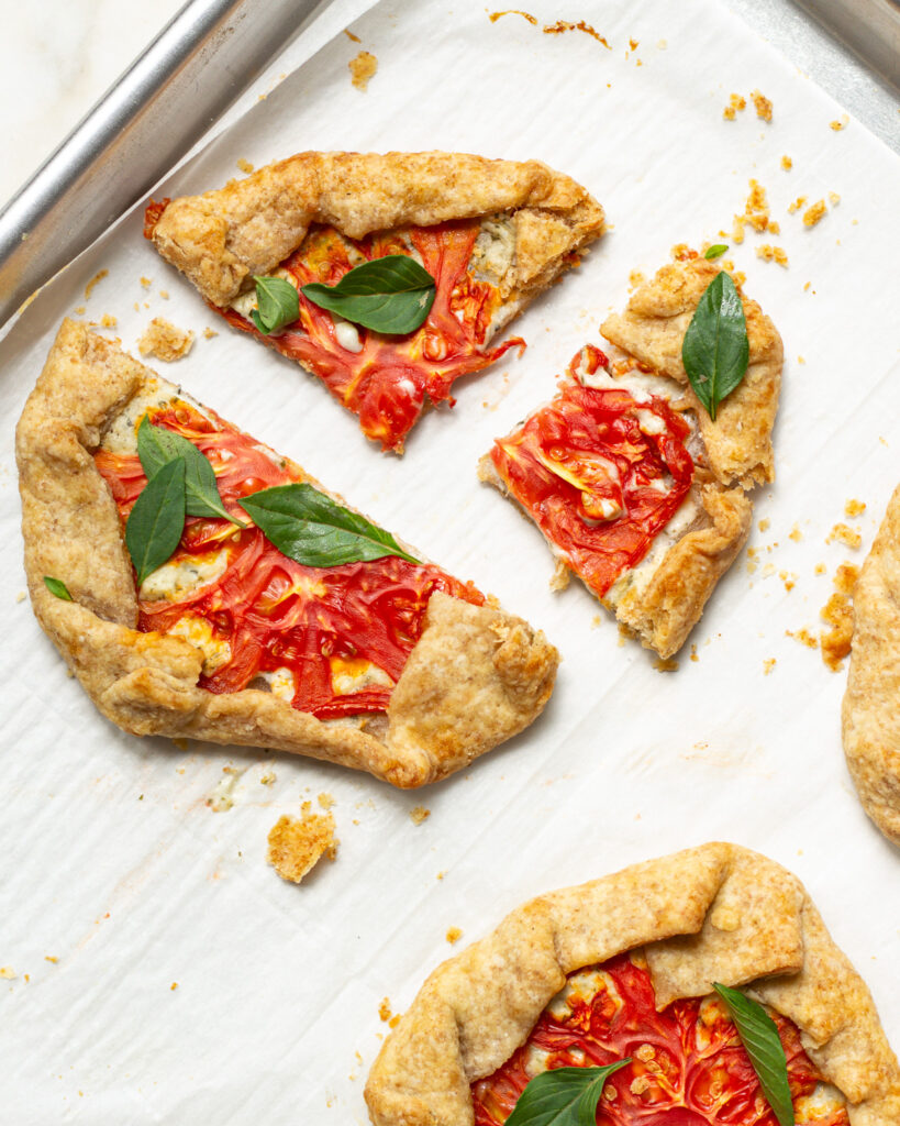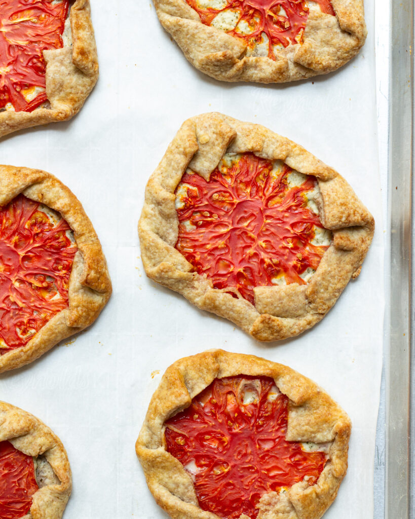 Roll out the pie crust until it is as thin as you’d have it for a normal pie. Use a bench scraper to carefully cut out circles that can encircle each tomato slice. You may have to cut some circles, then re-roll out any remaining pie scraps and cut new circles, continuing until you have enough pieces.