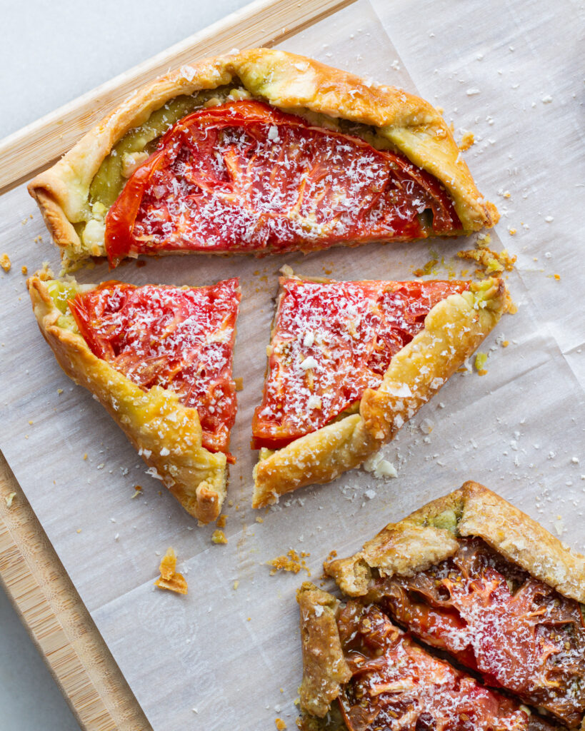 This tart is best made with big, juicy, peak-season heirloom tomatoes. Usually best bought in July, August and early September, when they are at their peak. If you scale this recipe up by two, you might want to use two large tomatoes of varying color, so you can mix and match each tart. If you are making the recipe as written, you should really only need one large, sweet and juicy tomato. But of course, it’s flexible! So scale up or down depending on the pie crust you choose to use.