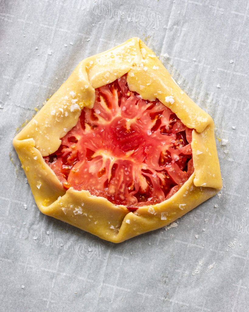 - When the oven is ready, whisk together the egg and brush all the edges of the crusts with a thin layer of the egg wash. Sprinkle the crust and tomato with flakey salt.