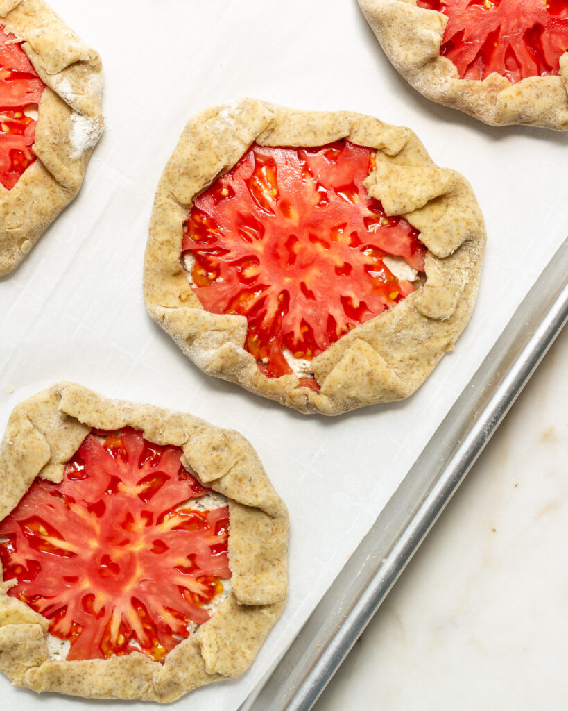 - Gently pull in the edges of the pie crust, folding them over the edge of the tomato slice similar to how you would pinch a dumpling wrapper. Place the tarts back in the fridge to chill while the oven finishes preheating.