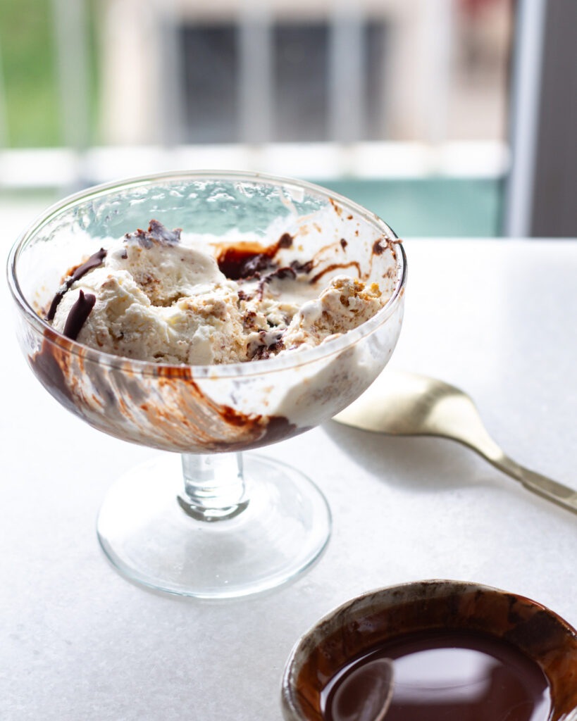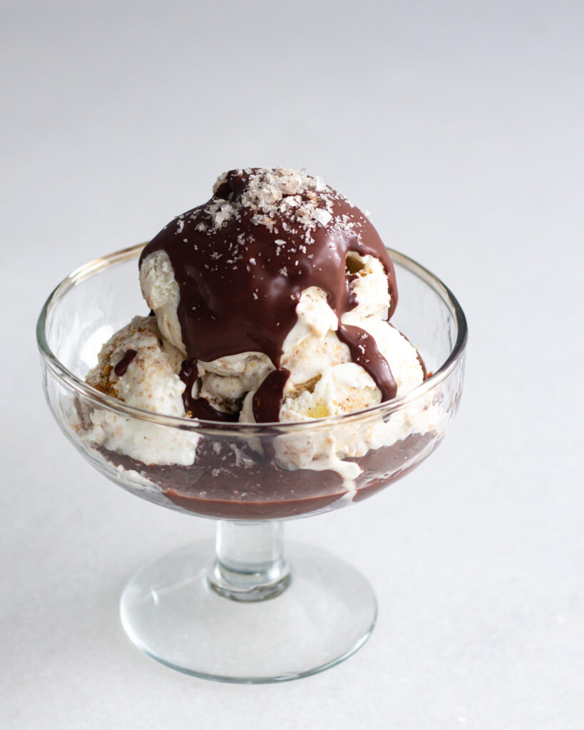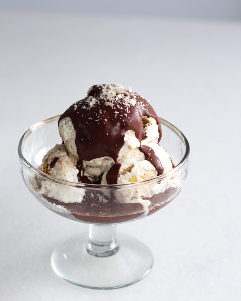 I first got hooked on this idea after going to Caffe Panna – this absolutely amazing gelato spot in New York City. There you can get one free “drizzle” and topping on a scoop, an I always get the olive oil drizzle and flaky salt. Before you say it sounds weird, olive oil on ice cream is absolutely heavenly. It’s rich, it has an earthy, luxe flavor to it, and it automatically elevates any flavor of ice cream. I can’t get enough, and with an olive oil chocolate shell, it’s like you get the best of both worlds.