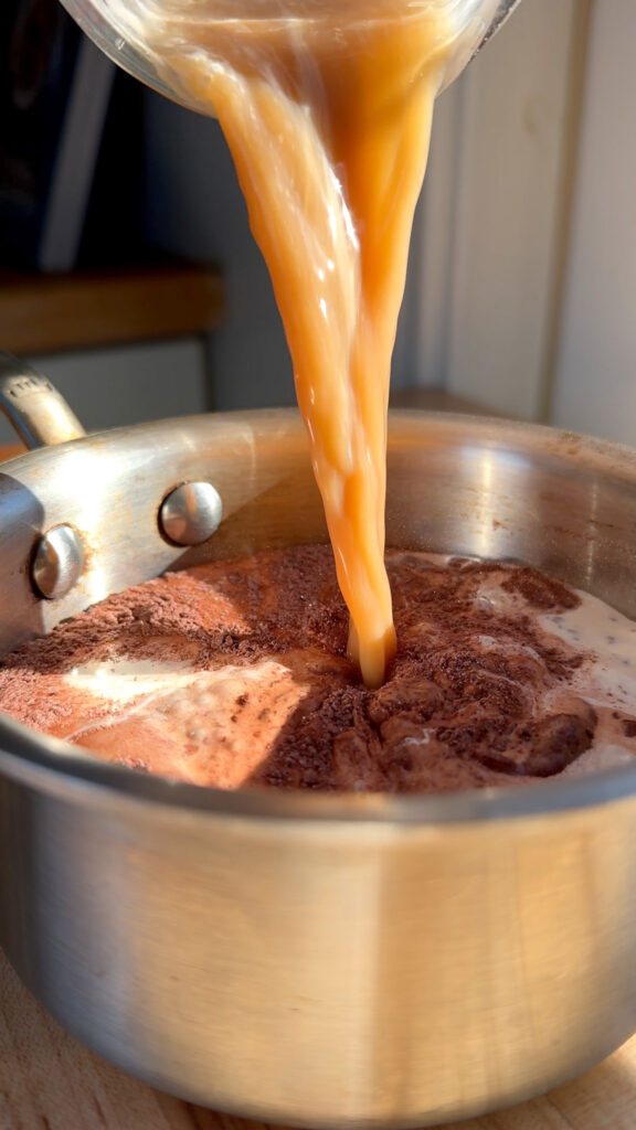 - In a small saucepan, add the chocolate, coconut oil and orange juice. Set this over medium-low heat and stir until melted.