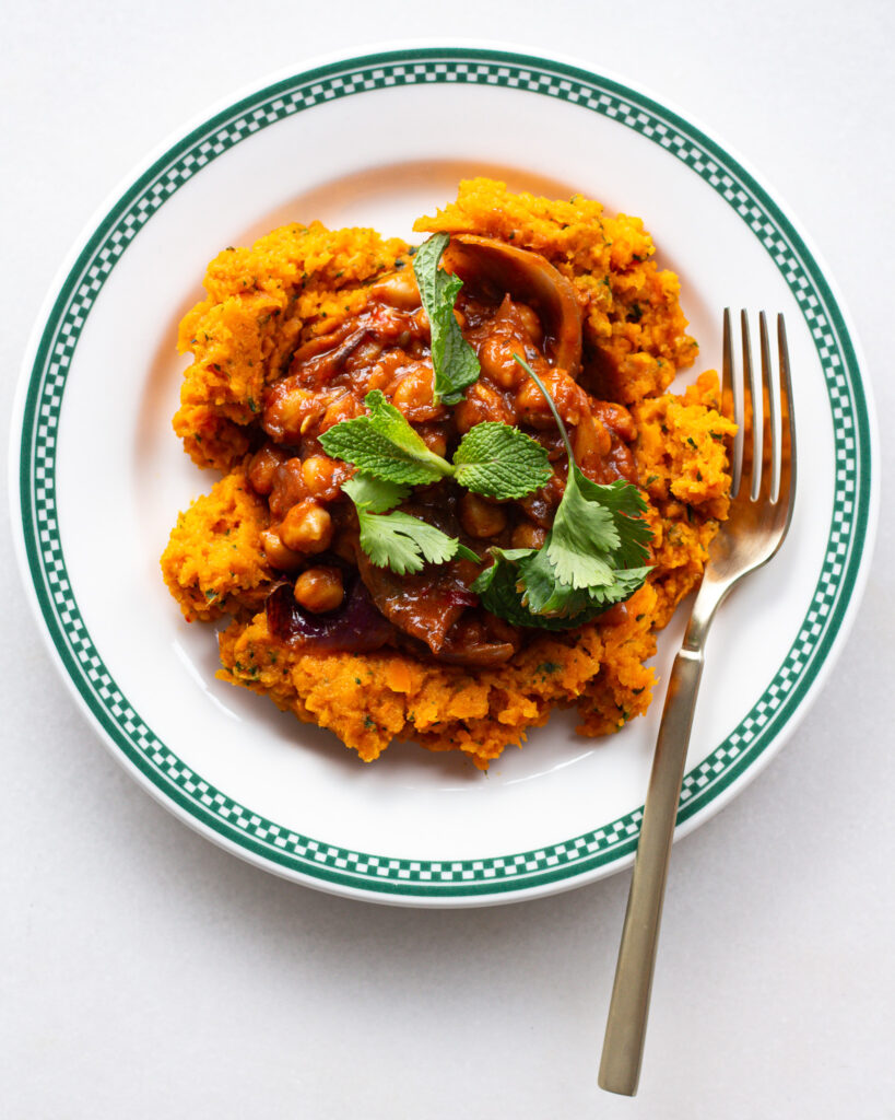 To plate everything, I like to make a scoop of the lemony carrot mash the base, then pile the chickpeas on top. Garnish with more cilantro and mint, and that’s it!