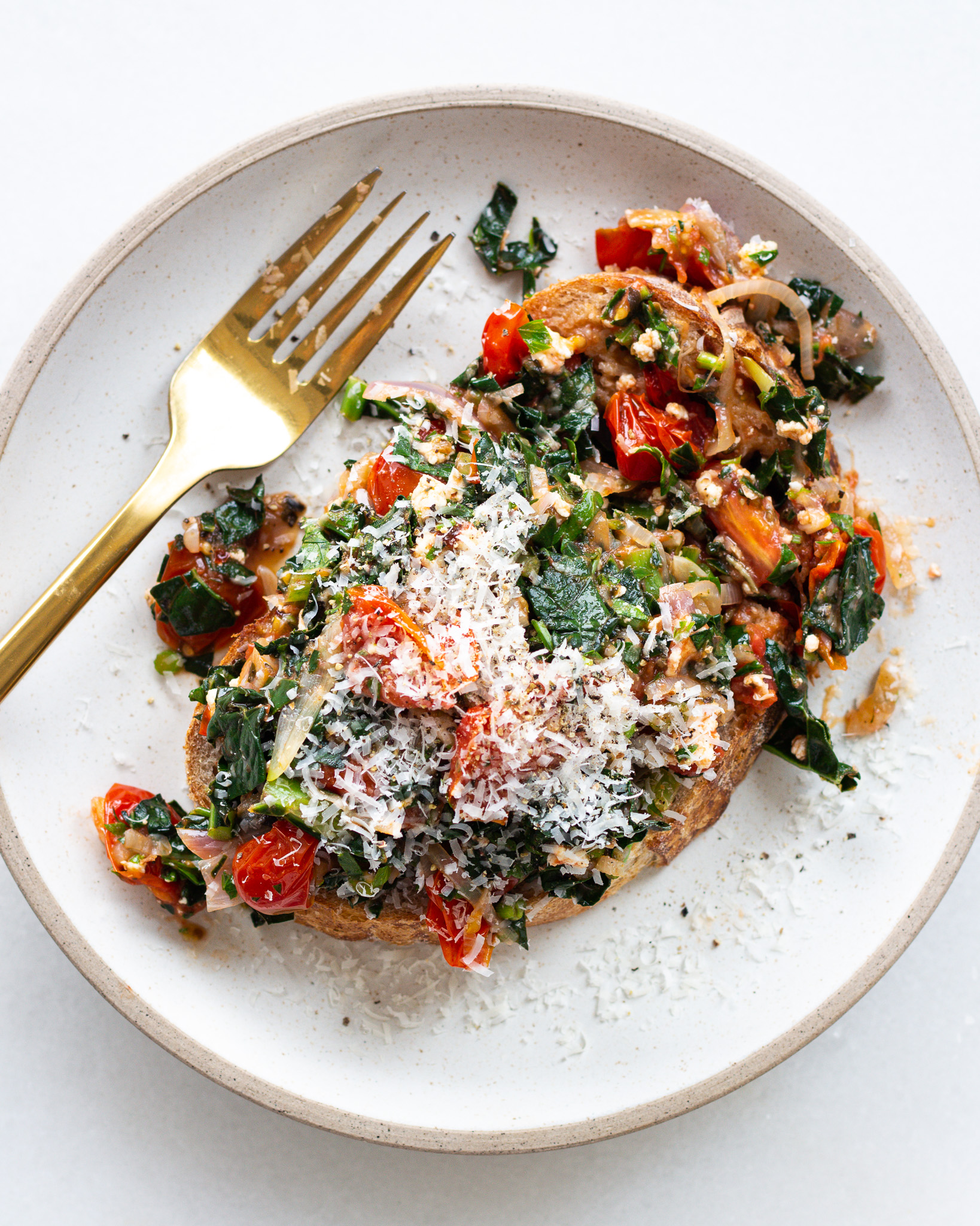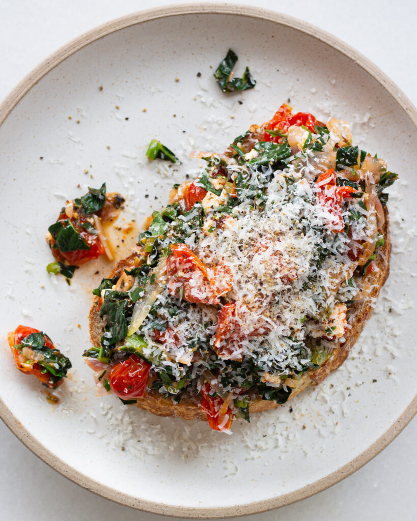 This is a more vegetable-packed pizza toast, though, and it’s referential to my childhood snack, while still packing a significant amount of additional flavor. This is a slightly more grown-up version, filled with fresh tomatoes, herbs and spices, garlic, shallot, kale and a healthy portion of olive oil. The cheeses used are a mix of fresh ricotta from my farmer’s market (love) and a sprinkle of parmesan, but if you’re plant-based, both of those things are completely optional. You can also swap the anchovies for crushed capers in brine, and it will become a fully vegan, pizza-y meal.