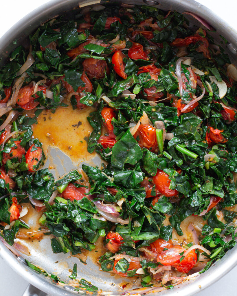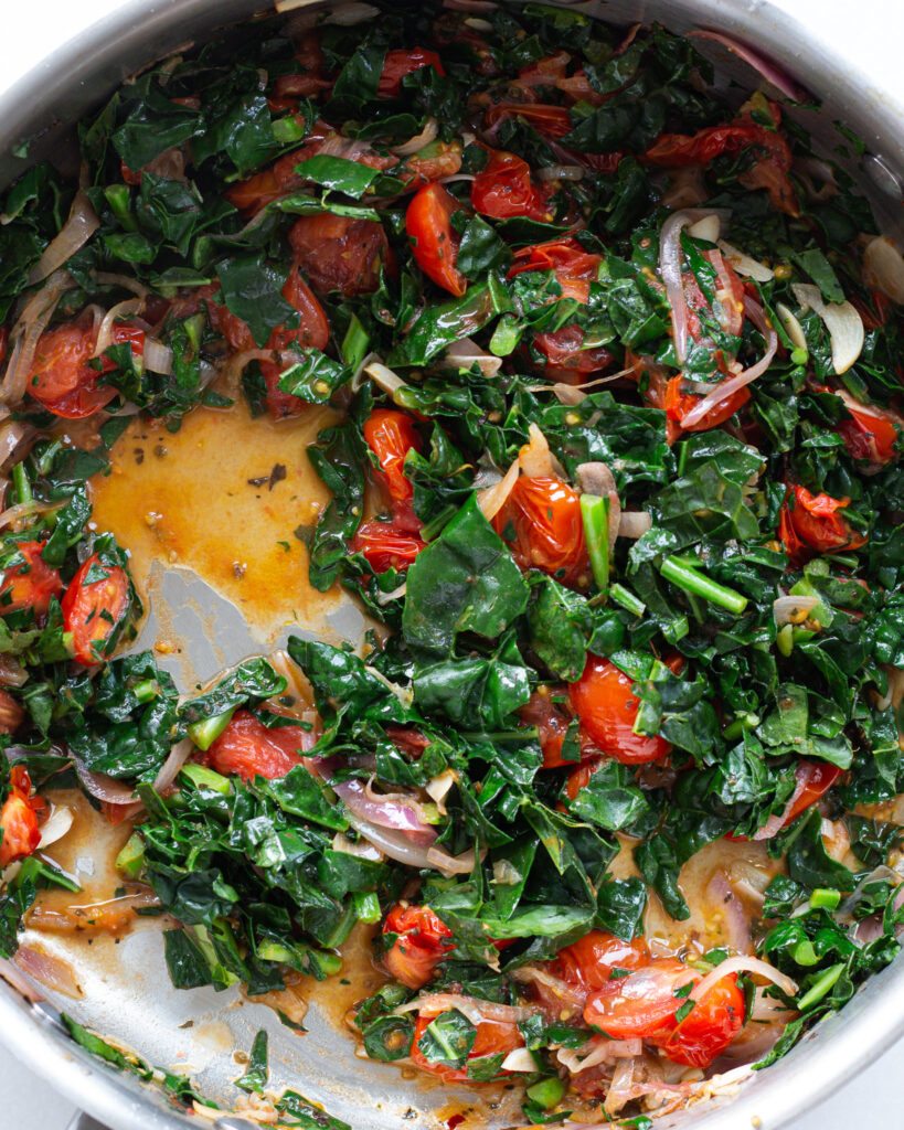- Cook an additional 2-3 minutes before adding the cherry tomatoes. Let them cook, stirring very few times, until they start to collapse, about 8-10 minutes. Add in the kale and a splash of water and stir often, encouraging the kale to melt into all the established flavors. Do this for another 2-3 minutes or until the kale is fully softened. Season again to taste.