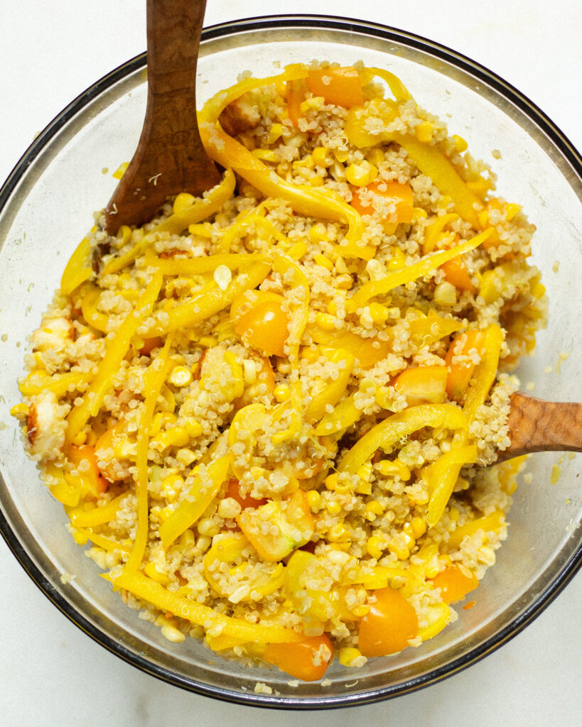This is a great question, and one that I knew I’d run into! I have some vegetables cooked in this quinoa salad and some raw strictly because I think that is how they are the most delicious. Raw sweet pepper and tomatoes add their bright, crisp flavors, while cooked corn and summer squash give their buttery, rich sweetness to the salad.