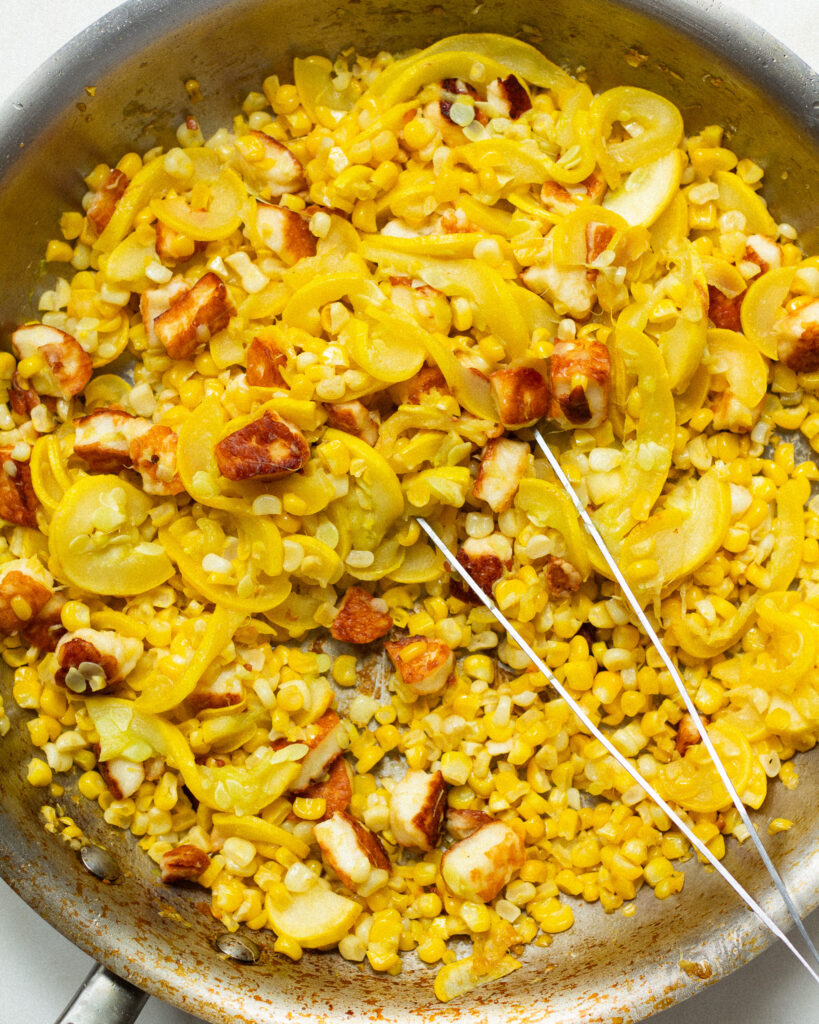 - When the halloumi has browned, add in the corn and squash. Season with a few large pinches of salt and cook, stirring often, for 7-9 minutes, or until the squash has softened and the corn is taking on a bit of color.