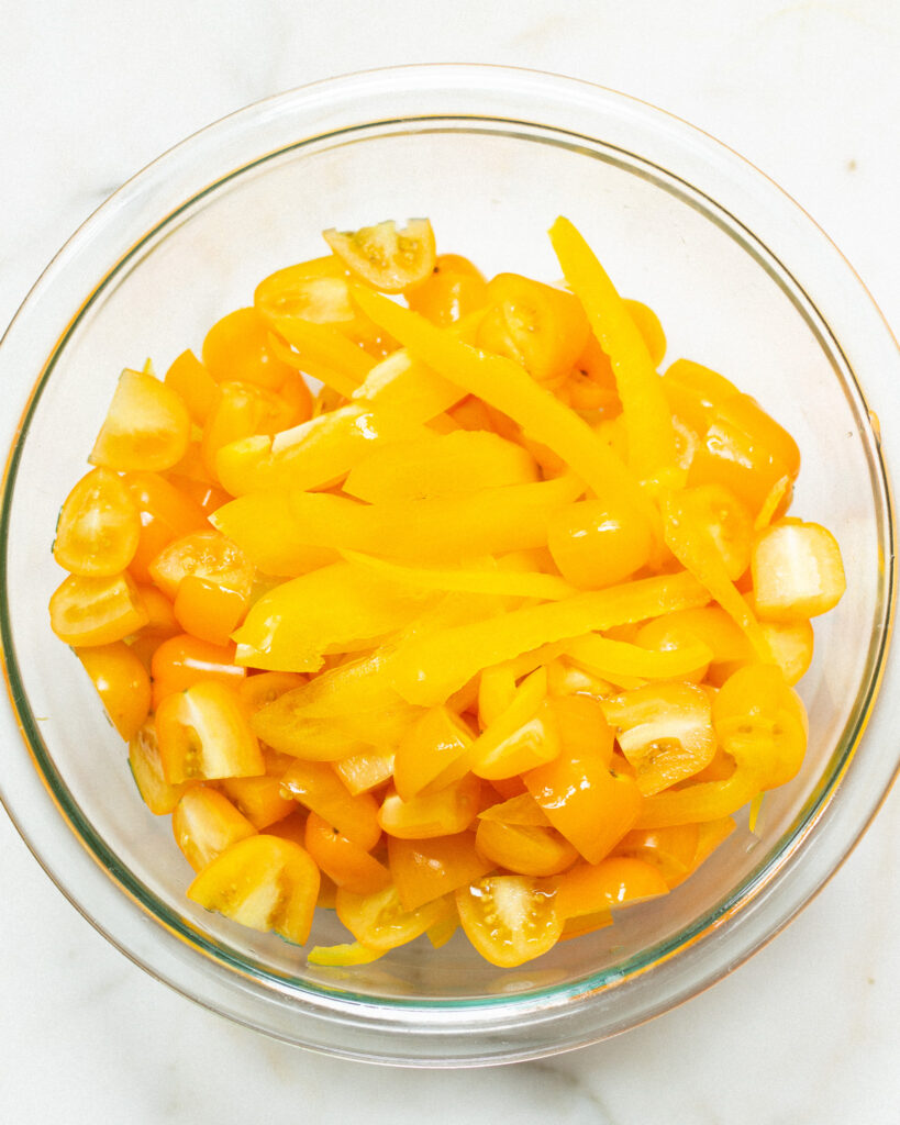 - Thinly slice the sweet bell pepper and quarter the cherry tomatoes. Set those aside.