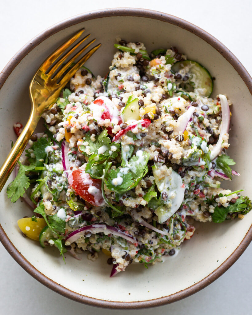 I have a few salad-building rules I find helpful, especially when I’m looking to make the best quinoa-lentil grain bowl out there. Here are my rules to live by, which I hope this recipe covers: