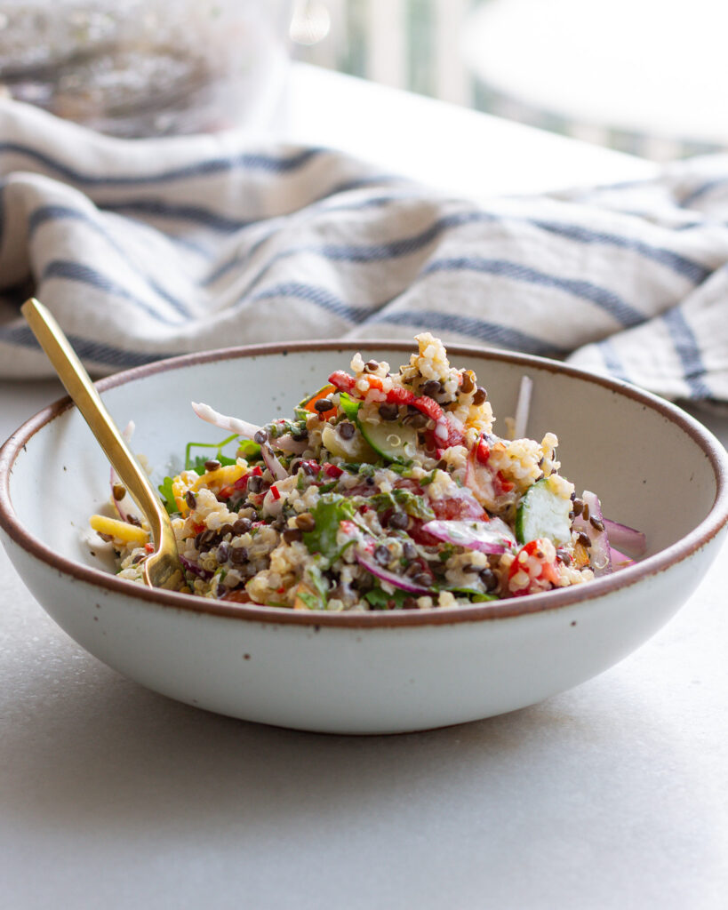 But the dressing is not the only merit of this salad – this quinoa and lentil bowl is perfect for summer meal prep. It’s hearty but doesn’t weigh you down, and it lasts in the fridge for up to five days. It’s a great grain salad to eat at the beginning of the week for dinner, and then use for lunches as you need them! I have some sitting in my fridge right now – so consider my point proven. 🙂