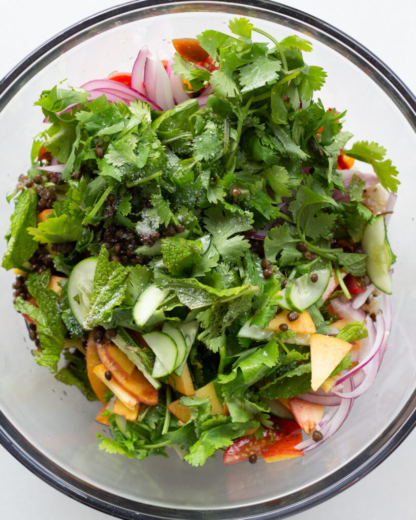 - Tear the remaining mint and cilantro into a large bowl. Slice the remaining Fresno pepper and add it in as well. Add in the red onion, tomatoes, peach, cucumber and chilled lentils and quinoa. Give a few big mixes and season with salt and vinegar. Add in about half the dressing and mix again.