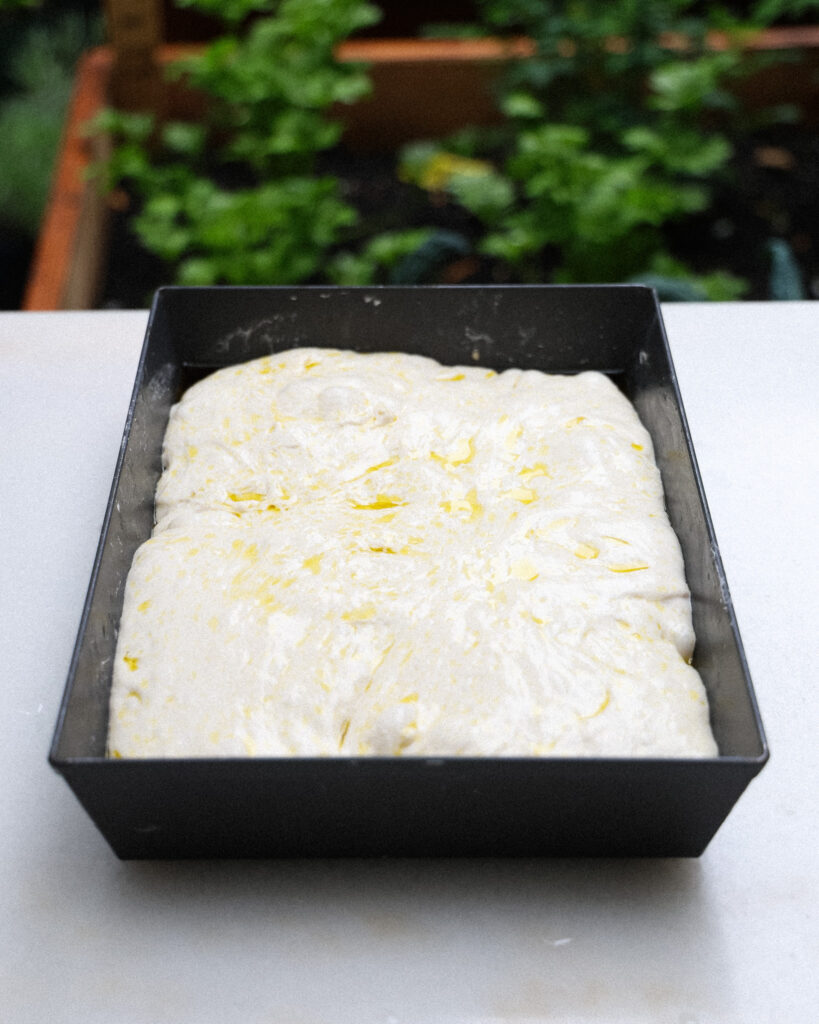 - Gently scoop the dough out of the pan and set it to the side. Coat the pan in 1/2 cup of olive oil. Add the dough back in, then "stitch" it up the center like you would a sourdough (see Note**). Cover and let the dough proof another hour and a half, or until it has fully relaxed to the edges of the pan and is bubbly.
