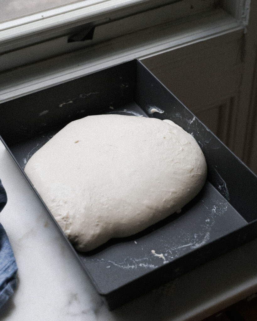 - The next day, remove the dough from the fridge and let it come to room temperature, about 2 hours. It should have relaxed out to all sides of the pan and be very bubbly.
