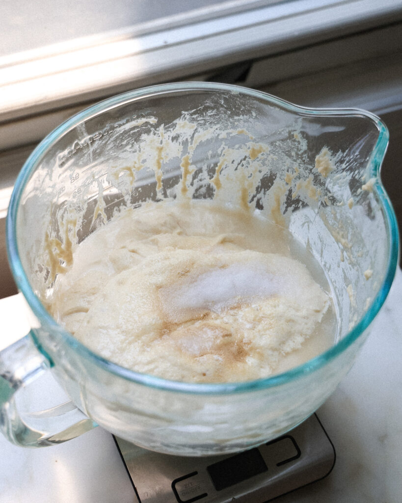 - Add in the 150 grams of active levain, 2 grams of active dry yeast, 15 grams of salt, 15 grams of granulated sugar, and 75 grams of warm water.