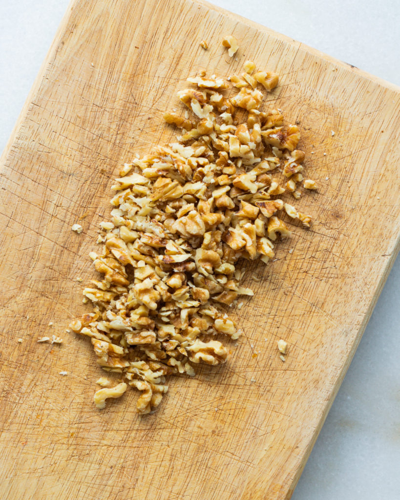 - Chop the walnuts roughly and toast them in a cast iron skillet on medium heat. Do this by working them around the pan for 2-3 minutes. You can also spread them on a baking sheet and toast at 425F for 3-4 minutes. Remove them from the heat when they are golden brown and fragrant.