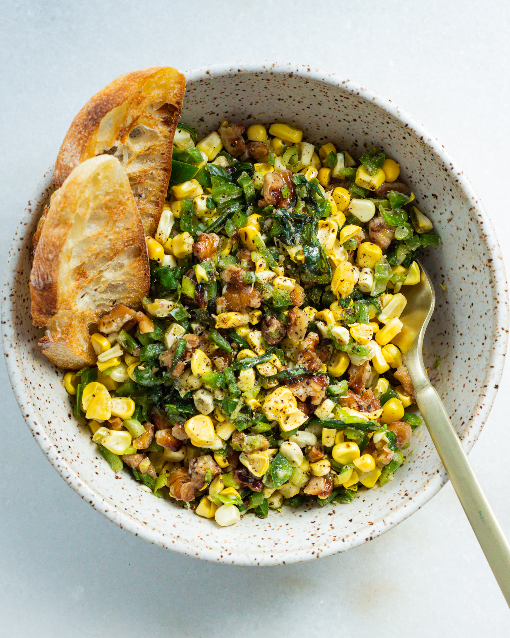 - In a large bowl, toss together the corn, jalapeño, scallions, basil and walnuts. Toss together.