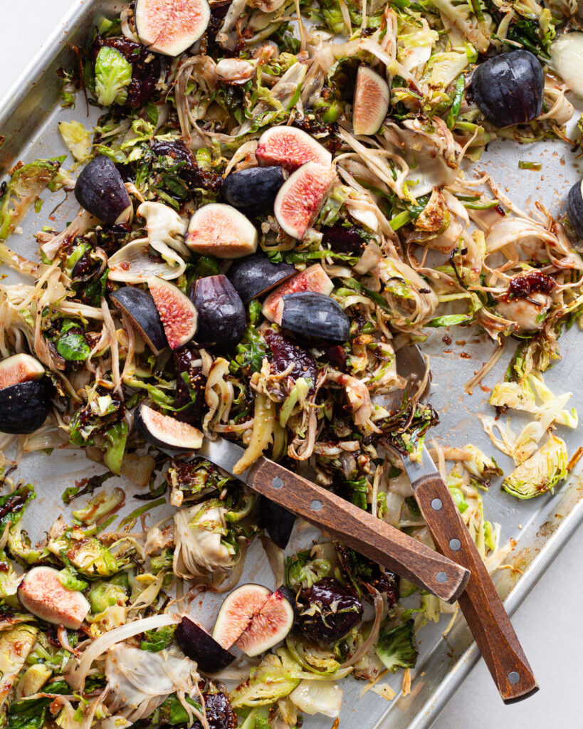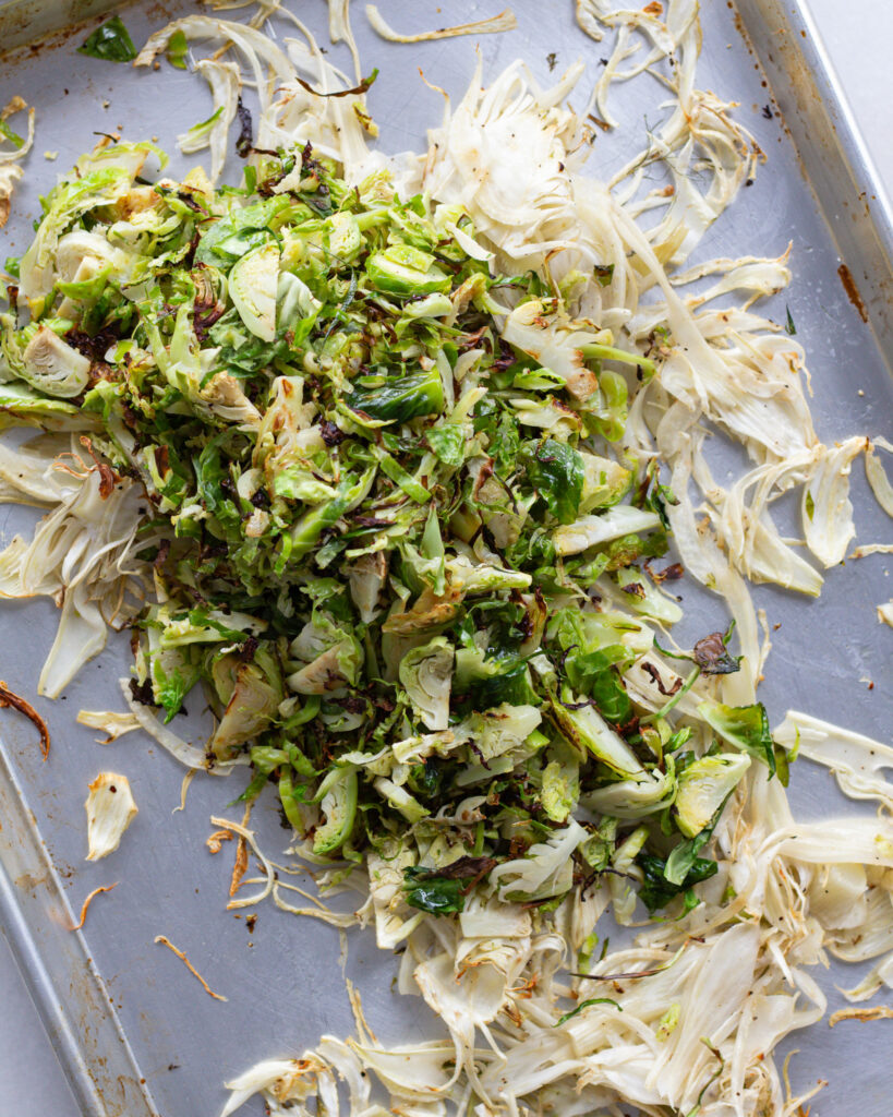 - Add the fennel to the baking sheet with the sprouts and pour over the dressing. Mix to combine.