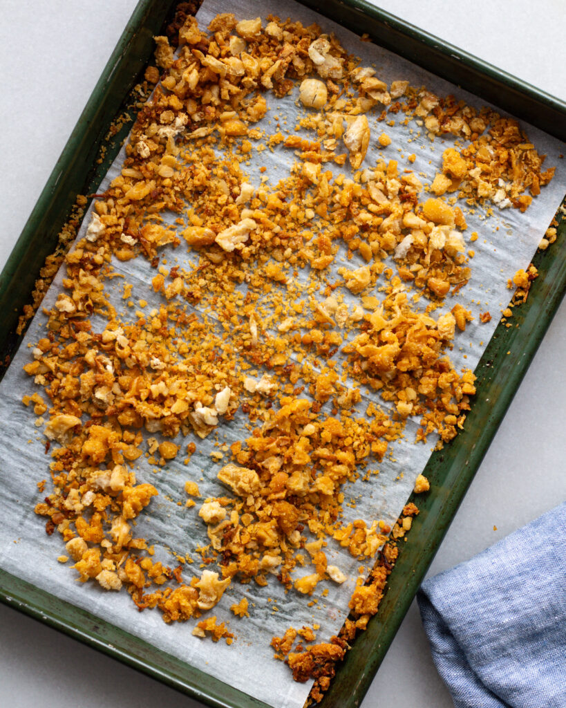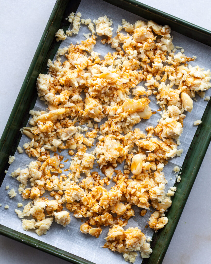 In a food processor, add the beans and pulse a few times. Fluff with a fork to create a bean “crumble” of sorts. Transfer this to a lined baking sheet and drizzle with 2 tablespoons of the chili oil. Evenly scatter the beans out and season with a pinch of salt.