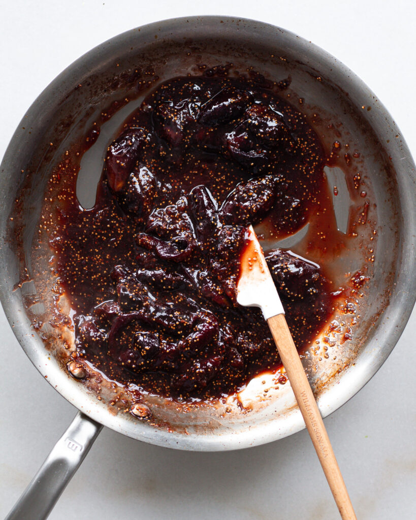 Halfway through the dressing’s cooking time, begin to mash the figs into the dressing. They should start to fall apart, and you can leave some pieces whole and some mashed in. Add the garlic and red pepper flakes and continue to stir.