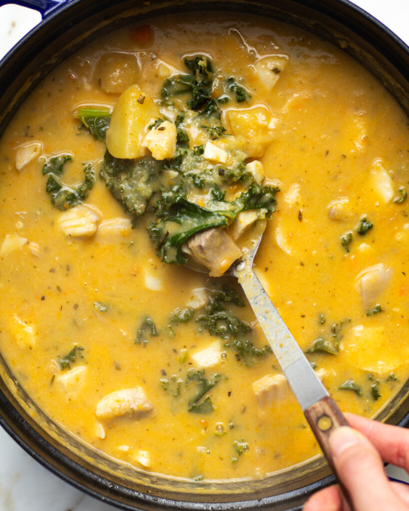 Now the sablefish: It is a white fish from Alaska, and I love it. It cooks down into a rich, tender texture, think of it like a mixture between salmon and swordfish. I cube it up and add it to the soup with the kale. Both only need six minutes of simmer time until they are perfectly combined in the soup. Heavy cream finishes it off, but you can also use cashew cream or half and half if you like!