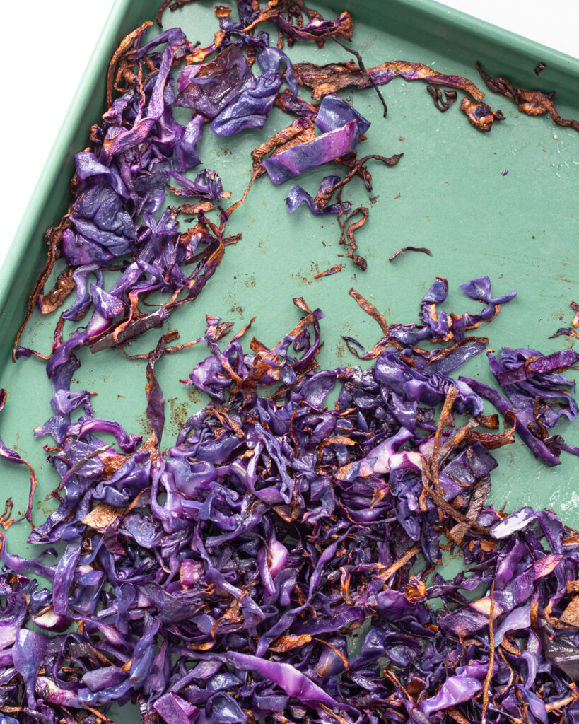 - Thinly slice the red cabbage and add it to a large baking sheet, make sure it doesn’t overlap and crowd the pan. Use two pans if necessary. Drizzle with olive oil and toss. Roast at 425°F for 18-20 minutes, or until the edges of the cabbage are brown and crisp.