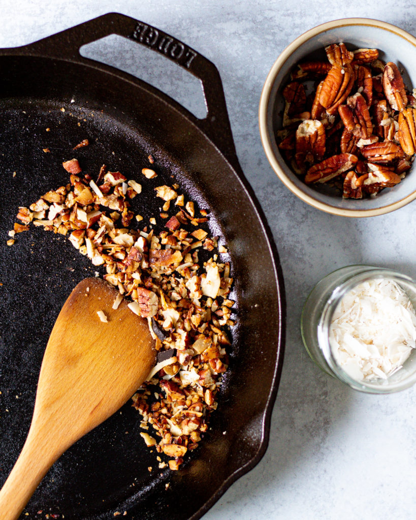 - In a skillet on medium heat, melt the coconut oil and add in the pecan pieces. Toast these in the oil for about 2-4 minutes or until you begin to smell them. Add in the coconut flakes and continue to toast for 1 minute.