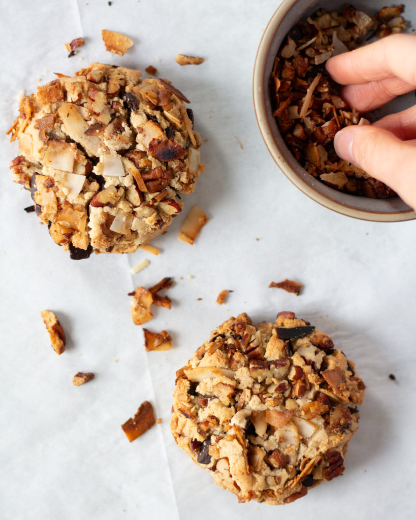 - A crunchy, coconutty “caramel” coating – with this recipe being vegan, I couldn’t make an OG caramel filling (plus like, talk about so much work). So to get all the rich, toasty notes of coconut and caramel, I use lightly toasted pecans, coconut shred and maple syrup to make a 2-minute candied coating. All you do is throw it on the stove and you will feel like you have a caramel crunch ready to go! It’s truly a magic trick.