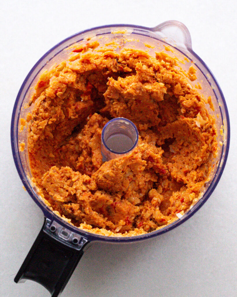 This is the no-cooking part of the recipe, but it probably makes my favorite part of the recipe. Just add the chickpeas, the roasted red peppers, the sun-dried tomatoes, salt, and the juice from 1/2 of a lemon to a food processor. Pulse until almost smooth, but still a bit textured. Set aside.